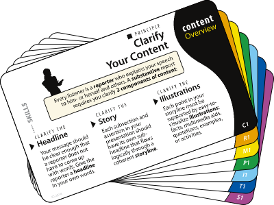 Pick a color based on what you want to achieve: understanding, interest, rapport, legitimacy, action, relevance, focus, or impact. Then choose and follow any like-colored technique card that fits your personality.